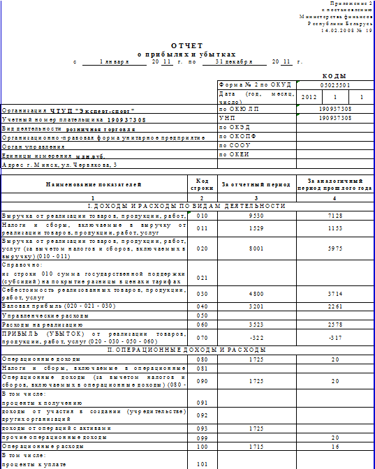 Отчет о прибылях и убытках ЧТУП «Эксперт-спорт»