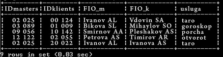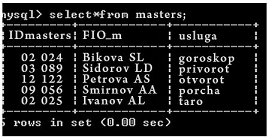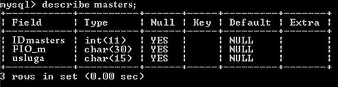 материалом. В ней будет две таблицы: первую таблицу назовем «masters» с полями «IDmasters», «FIO_m» и «usluga». Выведем описание типов