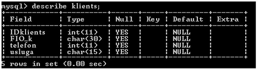 Рис. 2.3. Наименования и типы полей таблицы «klients»