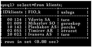 Аналогично создадим и заполним вторую таблицу и назовем ее «klients» с полями «IDklients», «FIO_k», «telefon», «usluga». Покажем описание типов