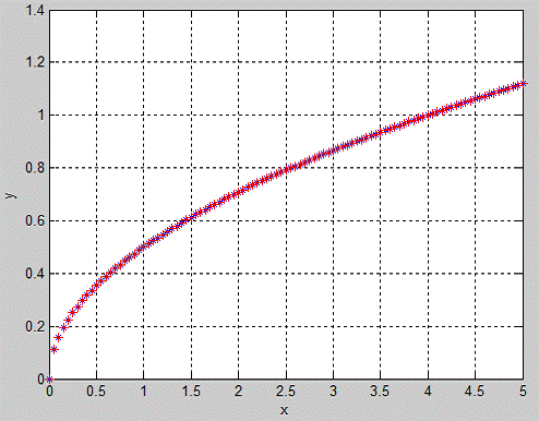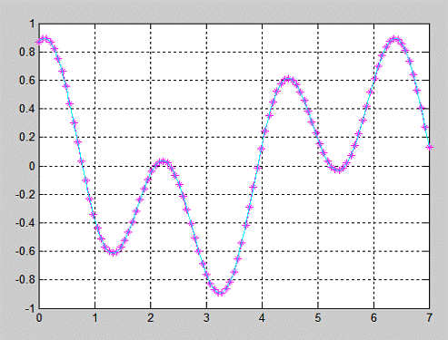 %6.2f | %6.2f |\n',v)(x,y,'m*-')onon('fun',[0 7],'c-')