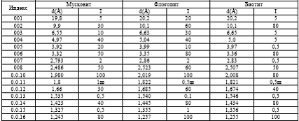 первого и третьего отражений слюды по данным Д.Д.Котельникова и А.И.Конюхова