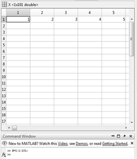 Запускаем Matlab. В Matlab выполняем заполнение массивов X и Y двумя способами. Для создания массива Х выполним следующую