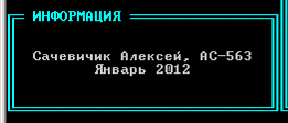 ',chr(186));(3,22,77,25); textcolor(15);textbackground(1);(' Программа разработана студентом группы АС-563,(с)