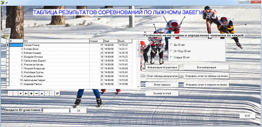 таблицы результатов лыжного забега. Языком программирования был выбран