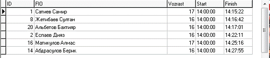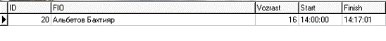 TObject);query1 do begin;.Clear;.Add('SELECT ID,FIO,Vozrast,Start,Finish');.Add('FROM