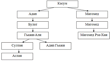 Сын его: Ильясъ бекъ Братья его: Шихъ Рагимъ Эседула Двоюродный брат его Бала