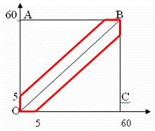 Позначемо за х і у час приходу , 0 ≤ х, у ≤ 60 (хвилин).У прямокутній системі координат цій умові задовольняють точки, що лежать всередині квадрата ОАВС. Друзі зустрінуться, якщо між моментами їх приходу пройде не більше 5 хвилин, тобто