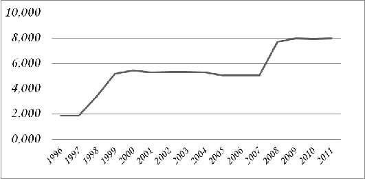 за даними 2011 р. близько 50 % його обсягу припадало на сім країн, при цьому,