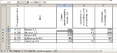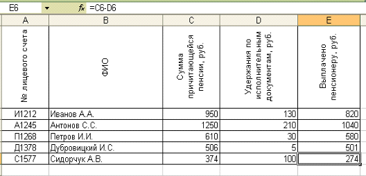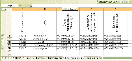 Рис. 8. Расчетные формулы таблицы «Свод лицевых счетов пенсионеров» за