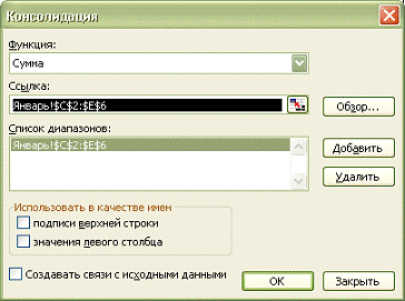 . Щелкнем поле Ссылка®щелкнем ярлычок Листа Январь, содержащий первый диапазон