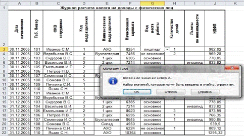 данной графы. Теперь, при вводе в данные ячейки посторонних значений, программа