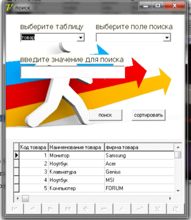 Форма поиска имеет выбор таблиц, а так же выбор полей по