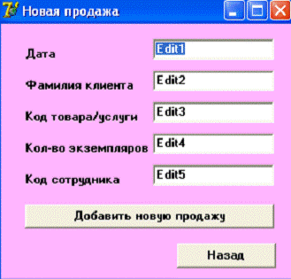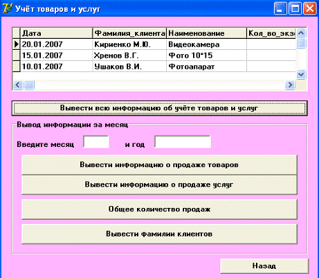 *.dfm}TForm6.Button1Click(Sender: TObject);.Close;.SQL.Clear;1.SQL.add('Insert into Учёт_товаров_и_услуг ( Дата,