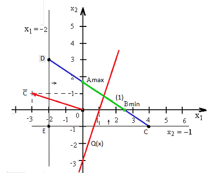 Прямая (2) проходит через точку x2 = - 1 параллельно оси x1