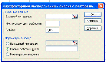 раскроется диалоговое окно Двухфакторный дисперсионный анализ с повторениями,
