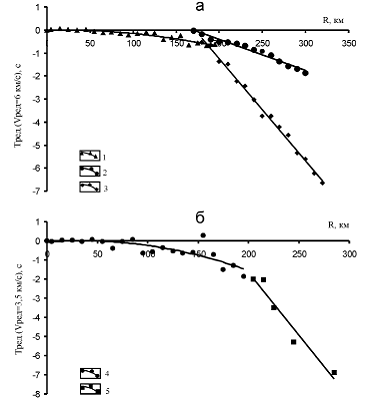 Кажущиеся скорости колеблются от 3,36-3,59км/с в начале годографа до
