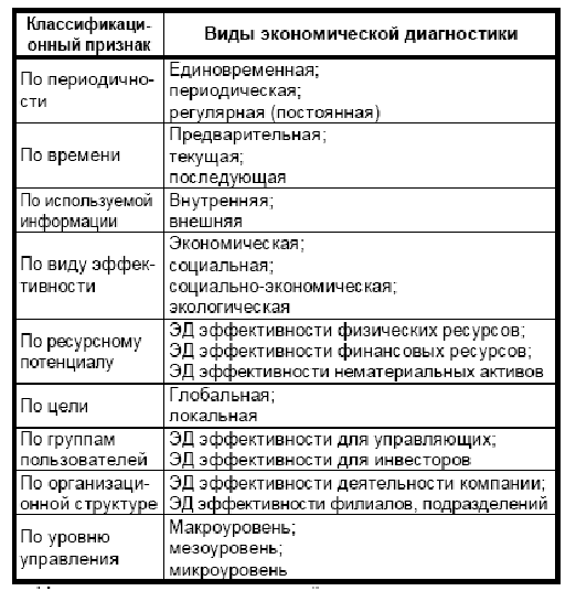 Таблица 1. Классификация видов экономической диагностики