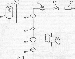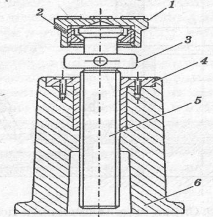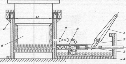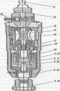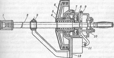 4-возвратная пружина; 5-ступица; 6-маховик; 7-ударник; 8-наковальня; 9-рычаг;