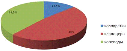 из них коловраток - 2, кладоцер - 19, копепод - 6, что составляет 7,4%, 70, 4%,