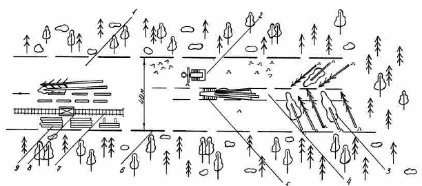 трелевочный трактор; 7 - узкая колея; 8 - вагонетка; 9 - штабеля бревен