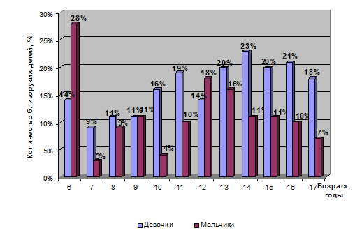 ) более высокая частота встречаемости близорукости среди девочек, чем