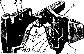 для корпуса автосцепки. На неподвижной части основания укреплена шкала 11, а на