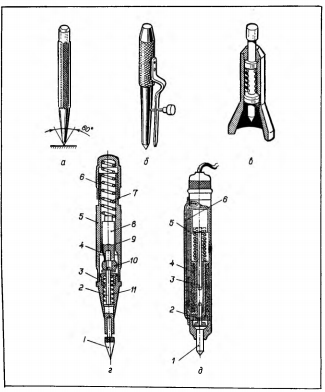 поверхні; г - нахил зубила до поздовжньої осі губок; д - кистьовий удар; е -