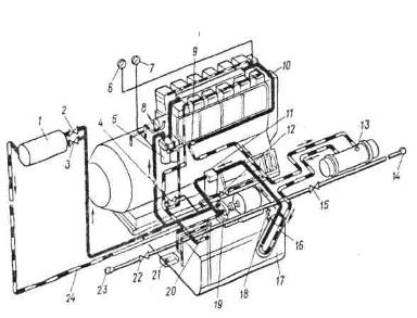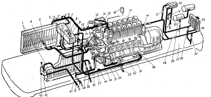 нагнетает ее в водяные коллекторы дизеля, откуда она поступает на охлаждение