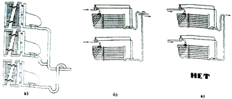 воздухоохладителей, в - схема включения батарей и теплообменника.
