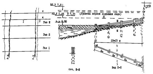 газопровода (15 - 20°), несколько выше по течению, устанавливаются деревянные