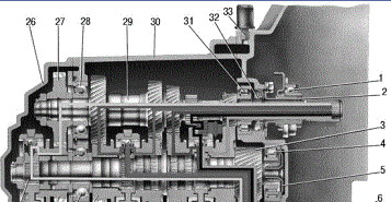 передач; 31 - роликовый подшипник первичного вала; 32 - сальник первичного