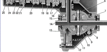 шестерни 16, 18, 19, 21, 23 и синхронизаторы 17, 20, 24 передач переднего хода.
