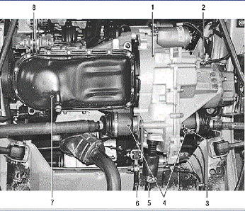 привода переключения передач; 7 -двигатель; 8 - правая опора силового агрегата
