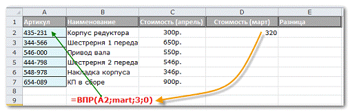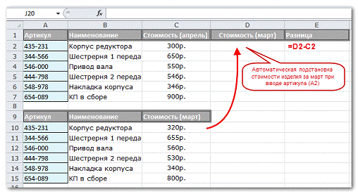 =Стоимость за апрель - Стоимость за март (=C2-D2).