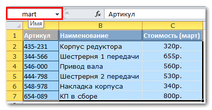 Наименование, Стоимость (за март и апрель 2012 года). Условно имеется всего 6