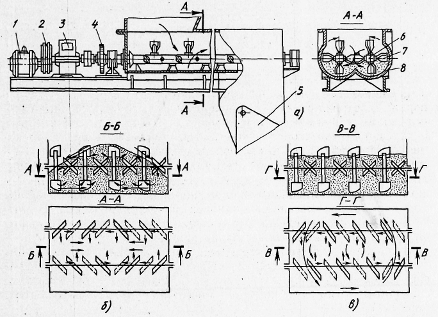 непрерывного действия: а - схема смесителя; 1 - двигатель; 2 - клиноременная