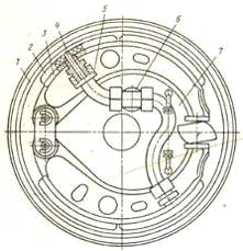 с цилиндрами 7. колодки соединены с оттяжными пружинами 10, 4 барабан, 5