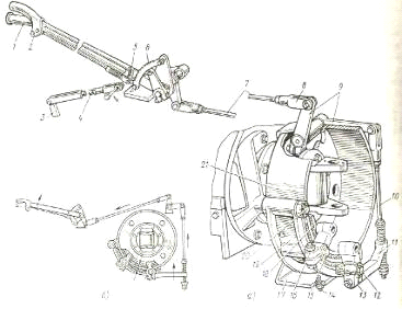 промежуточный угловой рычаг 9 и тягу 7, имеющую регулировочную вилку, соединен