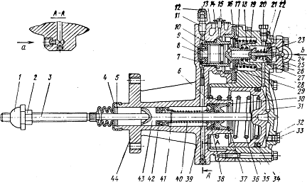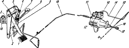 10-выжимной подшипник; 11-оттяжная пружина; 12-муфта выключения сцепления; 13-