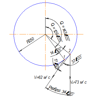 разброса дроби. Расчетный угол разброса составляет (143 - 129) + (37 - 17) = 34º.