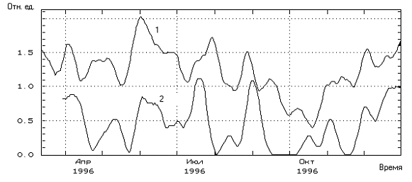 4. Фрагмент временного ряда подземного НП. 1 и 2 моменты землетрясений