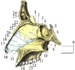 челюстных пазух, лобные отростки верхних челюстей, слезные кости, медиальные