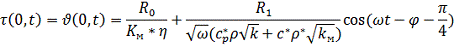 0.1;(t):=(R0+R1*cos(w*t-fii))*0.5;:=R0/(km*Nu)+(R1/(sqrt(w)*(Cp*p*sqrt(k)+0.5*sqrt(km)))*(cos(w*t-fii-Pi/4)));