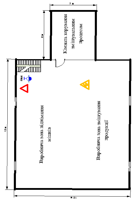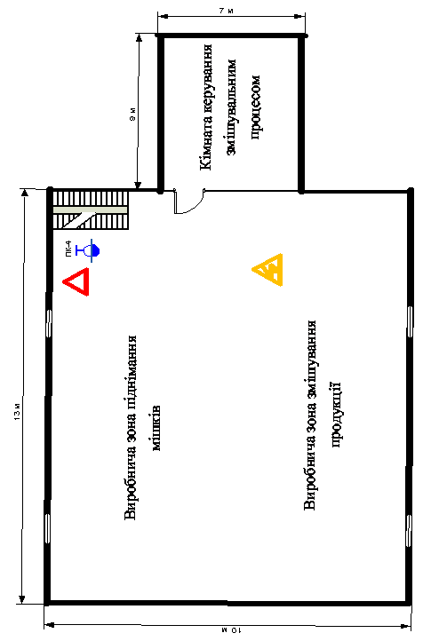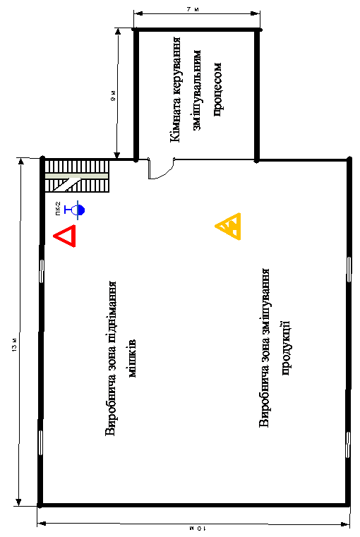 знаходиться біля задньої стіни цеху . Координати пожежі по осям: по довжині -