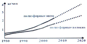 Мировое потребление полиэфирных волокон и нитей (рис. 4)