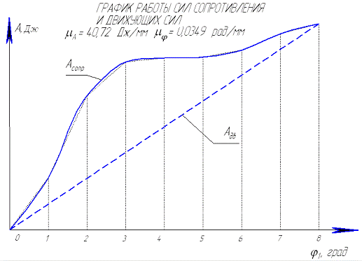 моменты инерции и движущих сил; построены графики работ сил и диаграмма