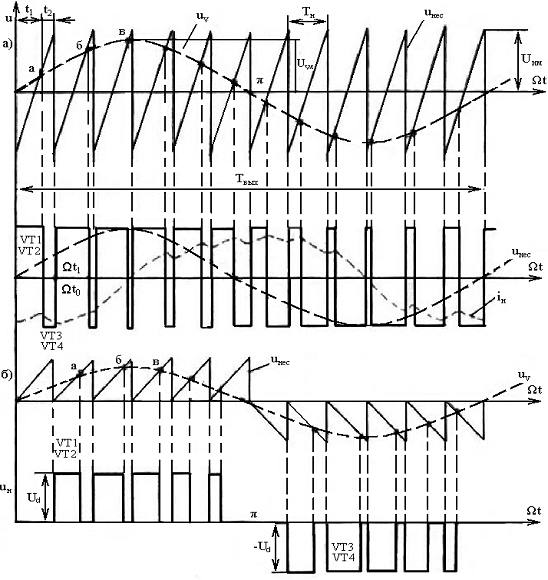 При однополярній ШИМ (рис. 7.б) транзистори VT1, VT2 комутирують при