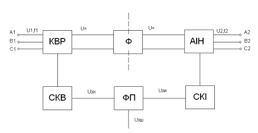 функціональну схему перетворювача частоти з ланкою постійного струму. Дати пояснення