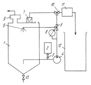 открывают кран 8, а кран 9 закрывают. Затем включают насос 10